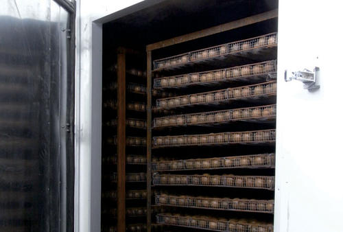 ③烘干三階段:降溫到55-60度之間,繼續烘烤2天,使果實的重量下降到相當鮮果的25-30%即可成為干果。采取關閉空氣能烘干除濕熱泵系統,讓其自然降溫,待冷卻后才能出爐。
