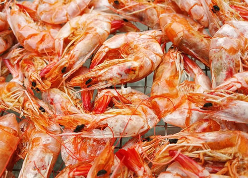 海蝦每百克蝦肉含蛋白質(zhì)20.6克,還含有脂肪、灰分和鈣、磷、鐵、維生素及核黃素等成分。蒸煮后可帶殼,也可剝殼對(duì)蝦仁進(jìn)行烘干。將煮好的海蝦瀝干水分后,均勻地?cái)傇诤姹P上,裝進(jìn)物料車,然后送入海蝦烘干房。