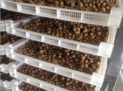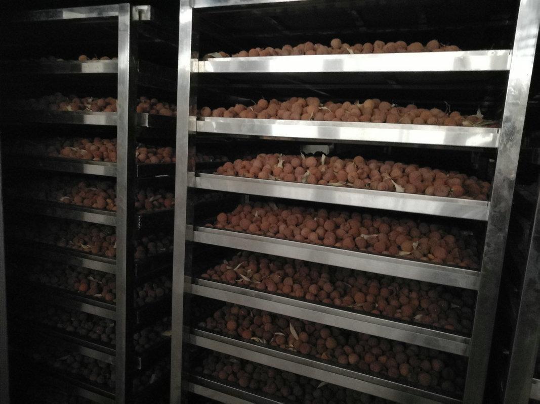 一段烘干,鮮果按料厚150 mm至200mm裝載在層架上,荔枝烘干機,先在65~70℃下密閉干燥一段時間;再在60~65℃條件下通風干燥30至36小時,出烘回軟或放入冷庫短時儲存。
