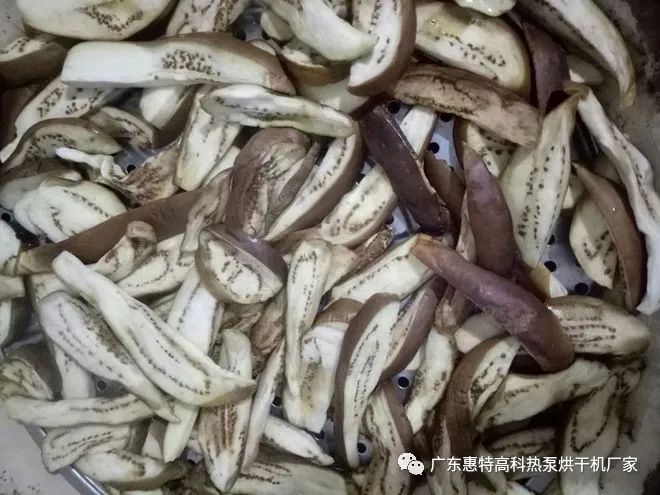 浸泡、烘干 將干茄瓣放在清水里浸泡20分鐘左右,讓其吸水膨脹變軟。然后用笊籬撈出,再放到烘干房內(nèi)進行烘干,烘干溫度可以設(shè)定在60-65度之間。烘干至茄瓣表皮無水汁,質(zhì)量比剛浸泡完時略有減少,但仍較半成品重45%——50%時為宜。浸泡的目的是為了脫去部分鹽分及茄子的苦澀味。