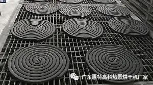 蚊香的烘干溫度控制在52-55度就可以了,蚊香含水量在40%,一片蚊香重50克,烘干后變為30克,一個托盤長900mm*寬450mm,放入蚊香18片,兩層托盤間距40mm,我們給客戶設計的固定式烘干房長8米,寬4米,高2.2米,可以一次放入1152托盤,蚊香總重量1噸多,烘干后需要脫水830斤,主機脫水每小時150斤,一批次時間為6小時,總耗電180度。