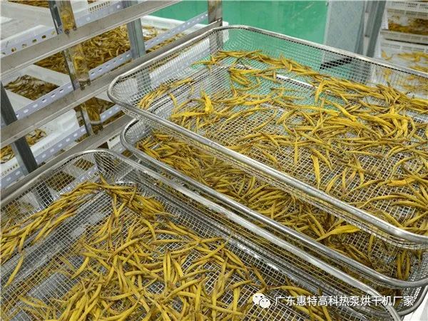 2、金針菜烘干機:金針菜空氣源熱泵烘干機烘干效果最為理想。由于金針菜采收期正值陰雨高溫季節,如只用自然曬干,就會有很多金針菜因為天氣原因沒有及時烘干,造成品質下降,甚至會發生霉變,造成很大的經濟損失。