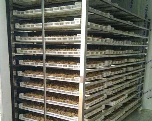 首先:我們需要將田七挑選好裝盤,均勻合理的擺放在托盤中,每層需要間隔10厘米左右,擺放不能疊加,以通風透氣為佳,能夠讓每層田七都受熱均勻、脫水干燥。